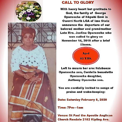 Late Mrs. Justina Oparaocha is the beloved mother of of a GOLDEN HEART ASSOCIATION CANADA MEMBER Mr. Ndubueze Oparaocha who resides here in Toronto diaspora community.  Please reach him at 6478646250 to  extend your condolences. If it touches your heart to assist him financially during this hard times, please indicate so that I can update your pledges promptly. Thank you all for your support.